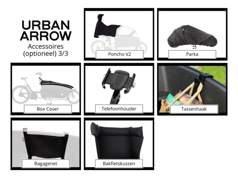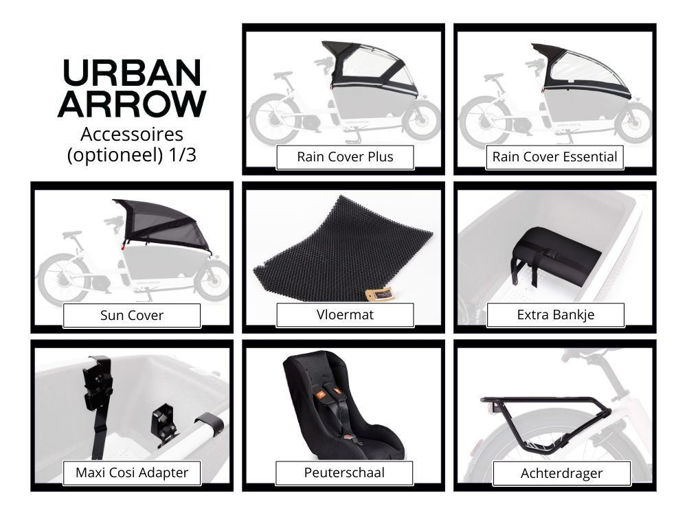 Kies bij aankoop van een Urban Arrow Family Active Plus of een Urban Arrow Family Performance Essential je accessoire actiepakket (t.w.v. €637 – €667) voor slechts €300!